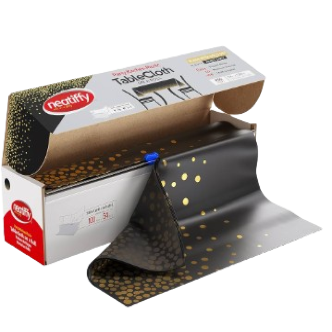 Biodegradable black/gold plastic tablecloth 54x108inch